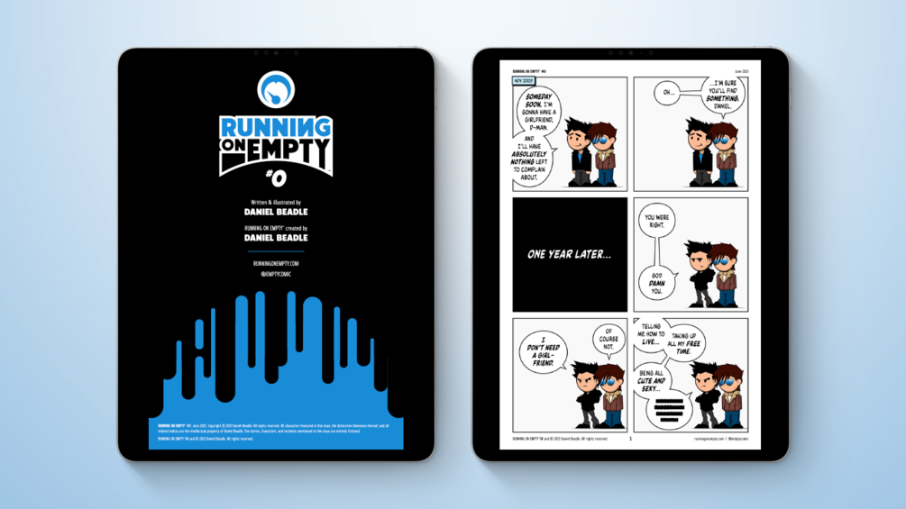 Get ready, pal-o-mine! Embark on a laughter-filled jaunt through the hilarious world of Running on Empty. This special digital edition zero issue serves as a delightful teaser to the ongoing series, introducing you to the endearingly flawed characters of Daniel, D-Man, Jake, and Jenna. Witness the comical misadventures that unfold as this dynamic quartet takes you on a wild ride through the chaotic comedy of life, love, and unfortunate haircuts.